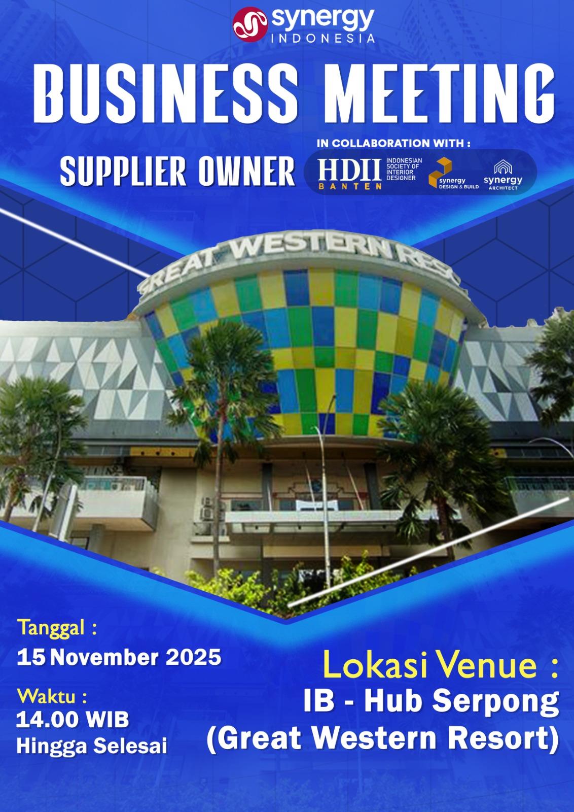 Synergy Indonesia bersama HDII Banten, Synergy Design & Build dan Synergy Architect serta Developer mempersembahkan Business Meeting: Supplier Owner, ajang silaturahmi dan kolaborasi antar pelaku industri interior, arsitektur, dan supplier di wilayah Banten.Acara ini menjadi wadah strategis untuk memperluas jaringan bisnis, berbagi peluang proyek, dan memperkuat ekosistem industri kreatif di kawasan Serpong.💡 Kesempatan emas bagi para supplier owner untuk terhubung langsung dengan desainer interior dan arsitek profesional dalam suasana networking yang produktif.Yuk daftar sekarang dengan klik tombol RSVP di bawah!