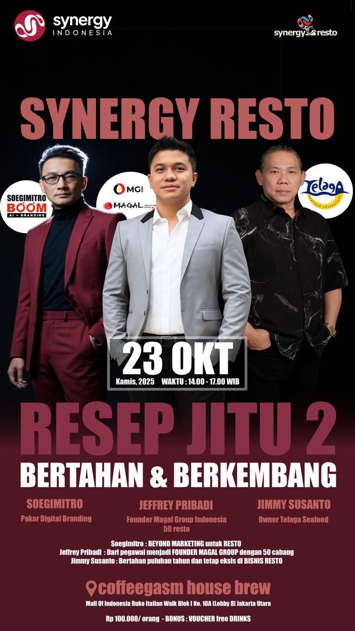 Setelah sukses dengan edisi pertamanya, Synergy Resto kembali hadir dengan tema “Resep Jitu 2: Bertahan & Berkembang” — sebuah sesi inspiratif untuk para pengusaha restoran yang ingin memperkuat strategi bisnis dan membangun daya tahan di tengah perubahan tren industri kuliner. 🎙️ Pembicara: Soegimitro — Pakar Digital BrandingTopik: Beyond Marketing untuk Resto Jeffrey Pribadi — Founder Magal Group Indonesia (50 resto)Topik: Dari Pegawai Menjadi Founder dengan 50 Cabang Jimmy Susanto — Owner Telaga Seafood (8 resto & 6 café)Topik: Bertahan Puluhan Tahun dan Tetap Eksis 💵 Biaya: Rp100.000/orang🎁 Bonus: Voucher Free DrinksAcara ini adalah kesempatan langka untuk belajar langsung dari para pelaku bisnis kuliner sukses dan menemukan “resep jitu” untuk membawa bisnismu tetap hidup, tumbuh, dan berkembang.Yuk daftar dengan klik tombol RSVP di bawah.
